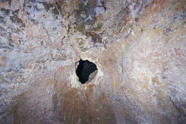 To begin work we had to get down on our knees and do our best to avoid smacking our heads on the ceiling. Working in this awkward position we would drill into the wall around the hole. That was difficult work. We really had to push on the drill, and it was still slow progress. Then we inserted the bullpin into the hole and hammered on it until the rock broke up. Then we would repeat the process. To give you an idea of how slow it went, the typical size rock that would break off was about fingernail size. If we broke off a large piece (about 1/3 the size of my palm) it was cause for celebration.