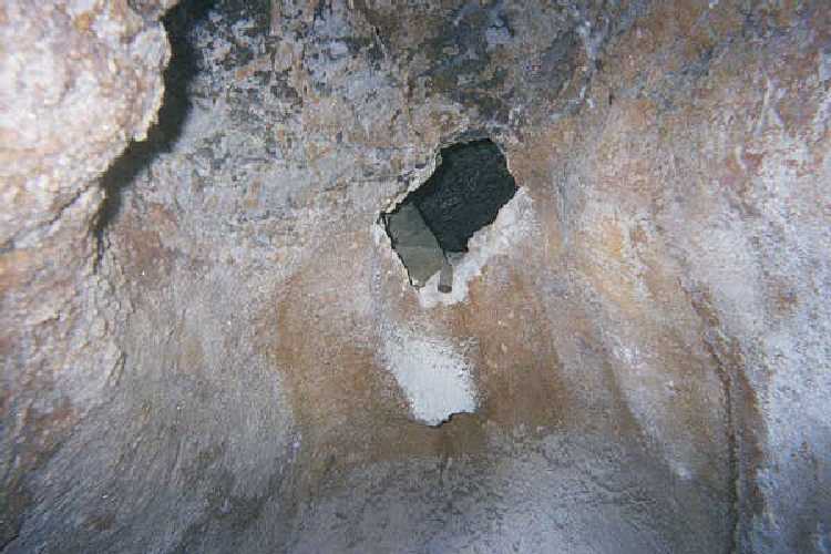 The final battery lasted another hour or so. We were sitting around talking about our progress when I decided to see if I could get my head through the hole. My head easily fit, but there was no way my shoulders were going in. As I was kneeling there contemplating how close we were I noticed something that B overlooked: The wind had stopped! In all of the times I've been in the cave I have always felt the wind blowing. The last time we were out working on the cave the wind was blowing worse than ever. Even earlier we remember the breeze cooling us off. But now, nothing! B said he did not know when it stopped. The rumbling had ceased, too. BIZARRE!