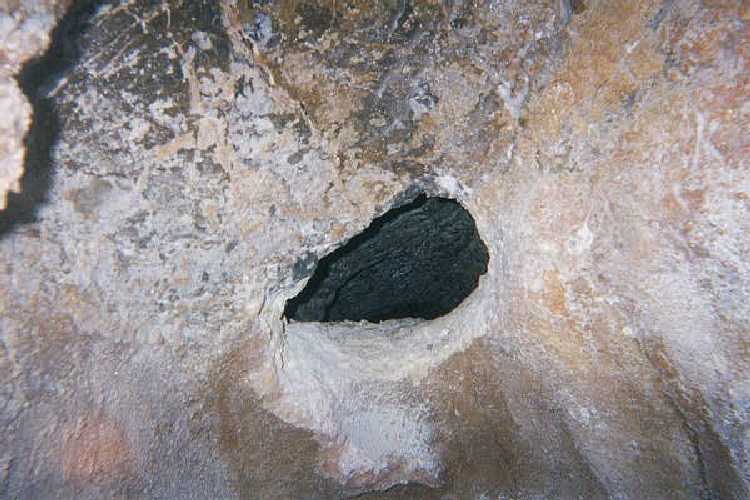 I was kneeling down and working the drill slowly into the wall at the time. I had my ear plugs in, my safety glasses on, and was lost in my own thoughts. Suddenly, over the squeal of the drill wearing down the rock, I heard a strange noise. It was loud. I could hear it over the noise of the drill, even though I had the ear plugs in. At first I thought it was just the drill bit doing its job on the cave. It would frequently complain by screeching and whining as we forced it into the wall. But this was different. It took me several full seconds to comprehend that this was coming from inside the hole, and not the bit. I stopped drilling and yanked my earplugs out just in time to hear the most terrible scream I have ever heard trail off and echo into the darkness of the cavern. I stared wide-eyed at the hole. For several moments I didn't move, nor did I breathe. I turned to look at B. Moments earlier he had been lying on the rope bag catching a nap. Now, he was standing upright, mouth open, with a look of concern on his face! I turned and looked into the hole again, half expecting to see a demon face staring back at me. Nothing was different in Floyd's Tomb. I fixed my gaze on the back of the squeeze, where the limits of my light reached. There was no motion, only darkness beyond the reaches of my light. In the complete silence that followed I could hear my heart pounding in my ears. Not another sound could be heard in the cave. Suddenly I heard a scraping noise behind me and straightened up. I nearly knocked myself out hitting my head on the overhang. It was just B moving to turn on his light but I was so wired it nearly sent me to my grave. B spoke and again I jumped. He said to get some rocks and put them into the hole. He explained that whatever animal had made that noise might be able to get through the hole. I immediately grabbed a few rocks and hoisted them through the opening. Using the handle of the sledge hammer I slid the rocks as far back into the tunnel as I could reach, creating a wall between us and the other side. Since the squeeze is so small it didn't take long. The entire time I was doing this, however, I was thinking that the noise certainly did not come from an animal! I didn't know if B really thought it was, or if he was just trying to convince himself. I didn't say anything to him about what I thought.