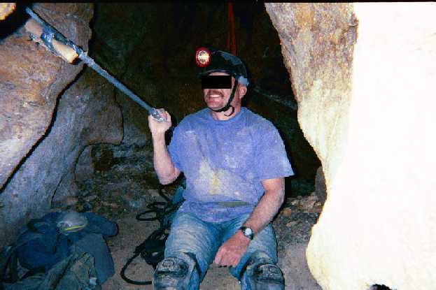 Here is a picture of B, edited to protect his identity, with the pipe we made. I took the picture, facing away from the Tomb. He is sitting on the rope bag that we used as a bed. Behind him to his left is the passage that leads down to the still water. Behind him to his right is the last drop-off before the passage. You can see some orange webbing we use to climb down and up.